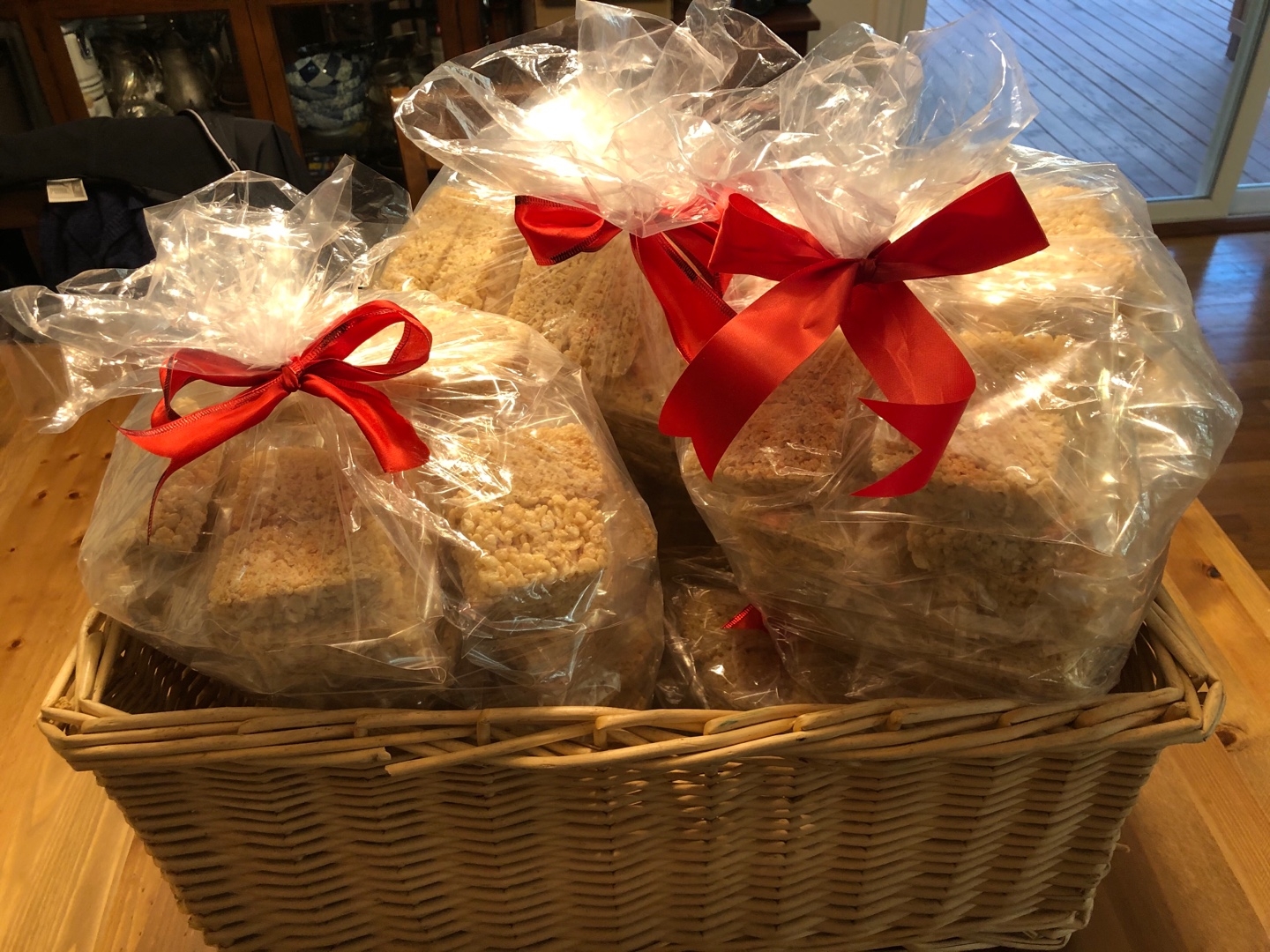 반죽을 하고 일일이 떼어 판에 놓고 구워야 하는 과자보다는 판으로 만들어 여러 개로 자를 수 있는 쌀과자를 (rice krispies) 만들게 되었다. 달달하니 커피나 차와 같이 먹어도 좋고, 쉽게 소화가 되는 과자다. 돌아가신 어머니가 좋아하셔서 가끔 아내가 만들어다 드리곤 하던 과자다. 어머니를 생각하며 노인들에게 드리게 되었다. 한 봉지에 두 개씩 넣으려면 300개가 필요하다. 두 판을 만들어 잘라보니 도합 9판이 필요하다.