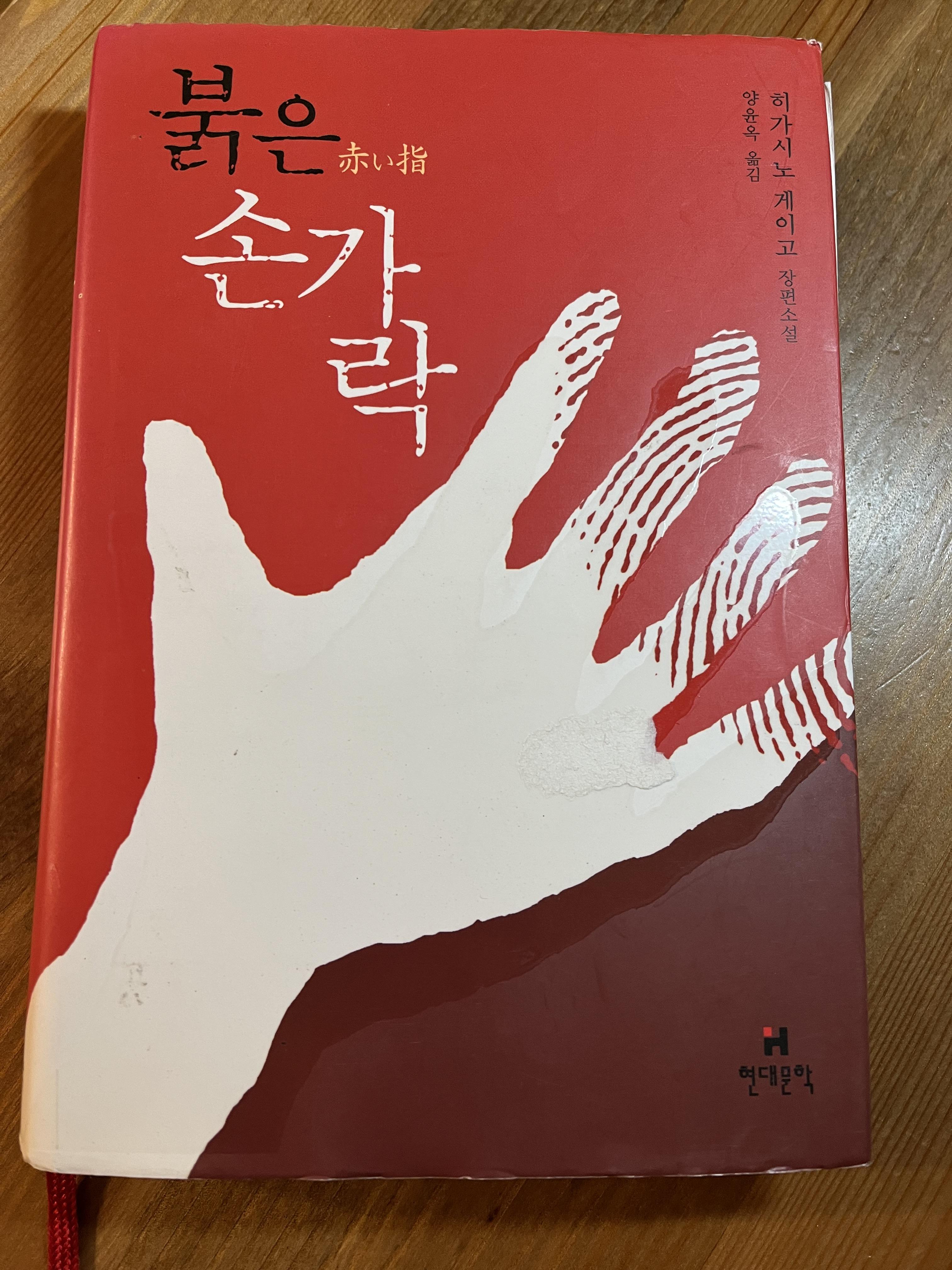 하지만 이 책을 읽으며, 그의 플롯에는 너무 인위적은 반전이 들어 있다는 생각을 하게 되었다. 굳이 그렇게까지 할 필요가 있을까 싶은 생각이 든다. 아키오의 어머니가 아들부부 앞에서 일부러 치매에 걸린 척했던 일이며, 나오미의 살해 동기, 그리고 병든 아버지를 찾아가지 않았던 가가의 행동 등이 다소 과장되고 현실감이 없어 보였다. 책 제목인 아키오 어머니의 붉은 손가락도 그중 하나다.