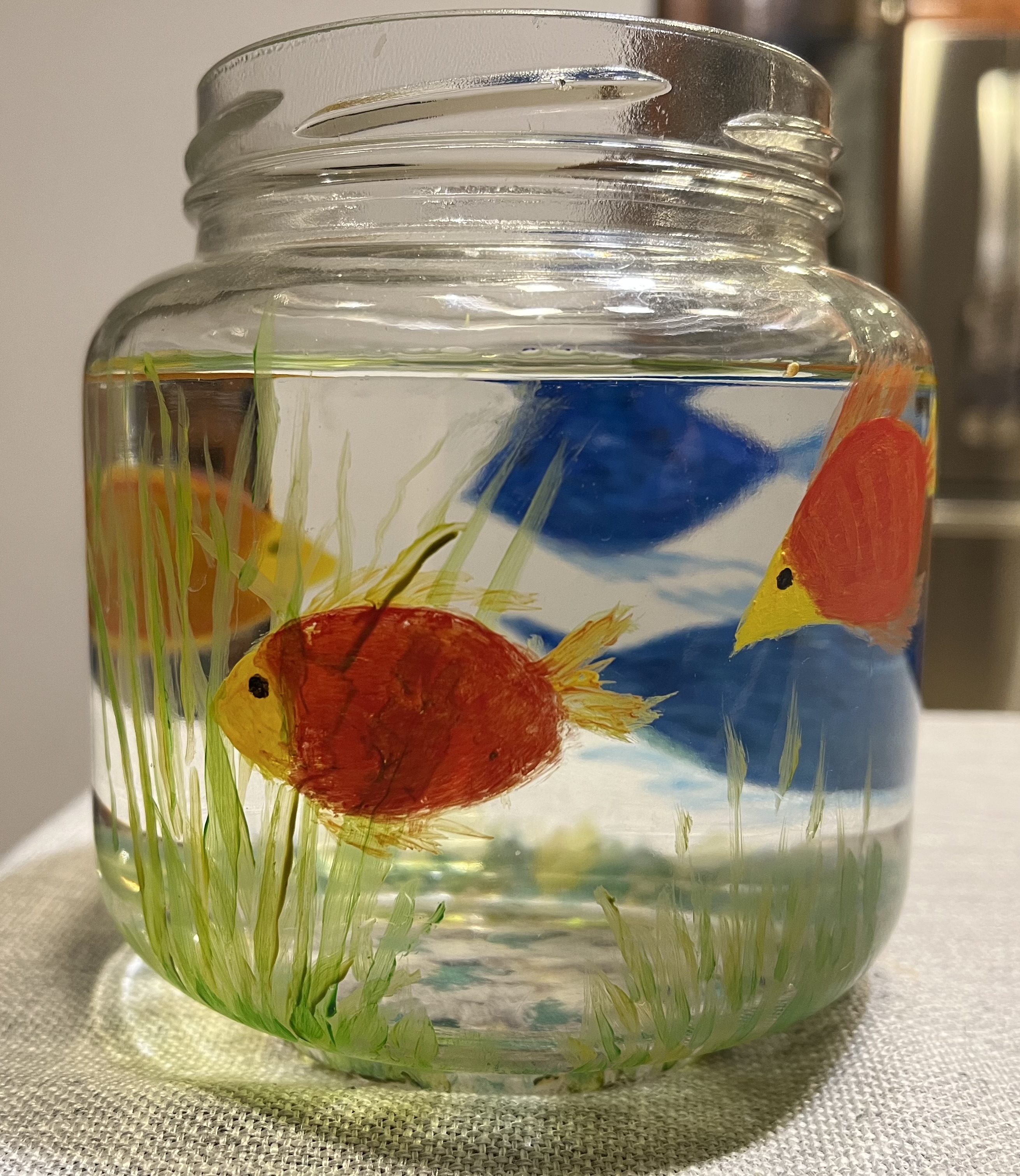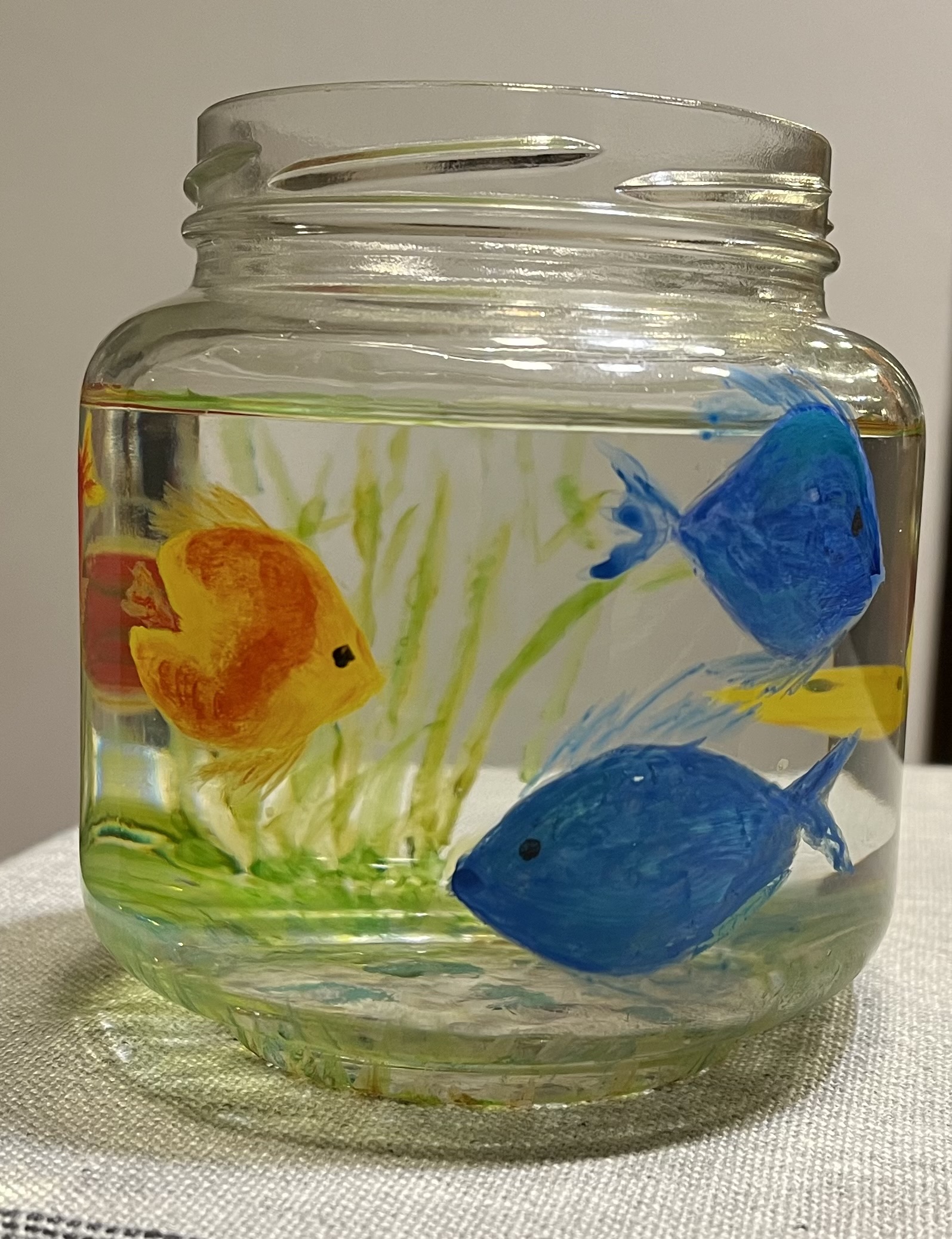 나는 빈병에 열대어와 수초를 그려 어항을 만들기로 했다. 이 과정에서 몇 가지 새로운 것을 배우게 되었다. 유리에는 물감이 잘 발라지지 않는다. 엷게나마 발라지는 색이 있는가 하면, 발라놓은 물감이 붓에 묻어 나는 색도 있었다. 일단 초벌을 하고 마른 후에 다시 바르기를 반복했다.