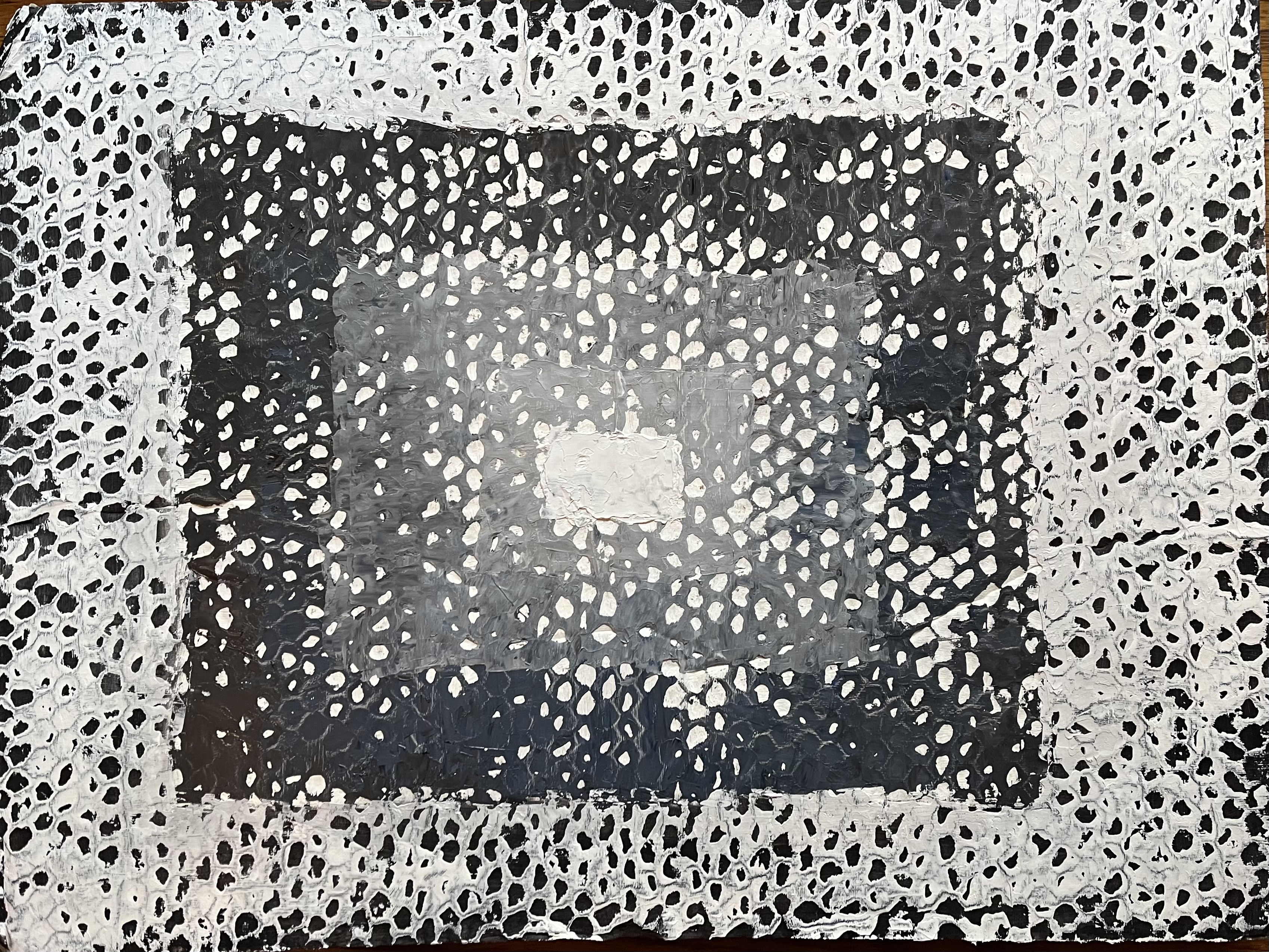 골판지에 흰색 젯소를 바르고 그 위에 나이프로 물감을 발라 하얀 무니들이 만들어졌다. 골판지 안쪽에 먼저 바른 물감이 마른 후에 바깥쪽에도 같은 방법으로 물감을 올릴 생각이었는데, 며칠 두고 생각을 해보니 반대로 하는 것도 좋을 것 같다는 생각이 들었다. 즉, 들어간 부분에 검은색을 칠하고, 나이프로는 흰색 물감을 바르는 것이다.